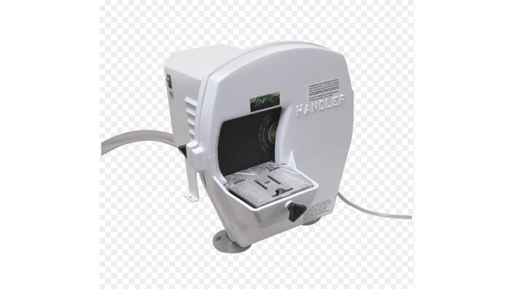 The Handler Model Trimmer 1/4 HP 10" is a professional-grade trimmer designed for efficiency and affordability. Powered by a 1/4 HP ball bearing motor with capacitor start, this model delivers reliable performance for those who require cost-effective solutions for trimming dental and laboratory models. It features easy-to-maintain components such as a swing-open front housing, a full-wheel radius water spray, and an internal gutter for water runoff. This trimmer is shipped ready to use with minimal setup and offers durability with its baked coating finish.